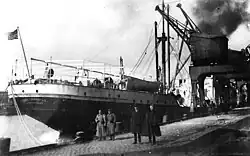 Setting out four days later, West Carnifax was slated to sail to Danzig via Falmouth and the Hook of Holland, but was diverted en route.[4] When she arrived at her new destination of Hamburg on 25 March,[8] she became the first American ship to dock in that city since before World War I had begun over 4+1⁄2 years before.[9] When she had completed unloading her cargo of flour, noted as the "choicest California flour" by onlookers,[10] she sailed for New Orleans by way of Plymouth on 2 April. On 9 May, four days after her arrival at New Orleans, West Carnifax was decommissioned and returned to the USSB.[4]