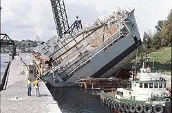 A first attempt failed when one of the supporting barges broke free and shot across the canal. The barge was retrieved and reattached, and on the following day, 4 October 1975, the second attempt was a success. She was gently pulled into position in the locks by tugboats, and transited the locks at high tide.[2][3]