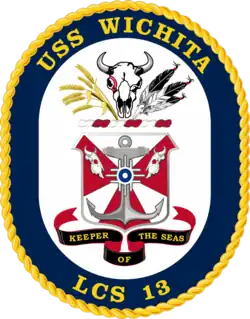 The keel laying ceremony was on 9 February 2015, at Marinette, Wisconsin.[2] Sponsored by Kate Lehrer, wife of Wichita native Jim Lehrer, the ship was christened and launched on 17 September 2016.[14][15] The naval crest of the ship incorporates elements of the Wichita flag, along with a bison skull and feathers representing the Native American heritage and wheat to reflect the state of Kansas's main crop.[16] She is assigned to Littoral Combat Ship Squadron Two. The ship was acquired by the US Navy from Lockheed Martin and the Marinette Marine shipyard on 22 August 2018 along with USS Sioux City (LCS-11) in a double delivery.[3]
