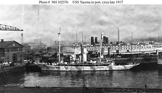 ![]() USS Yacona (SP-617) (foreground) at the Boston Navy Yard in Boston, Massachusetts, ca. December 1917.