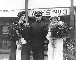 Miss Marjorie Zane (right) and her mother, Mrs. Barbara Zane (daughter of California governor William D. Stephens) at the christening of the USS Zane.