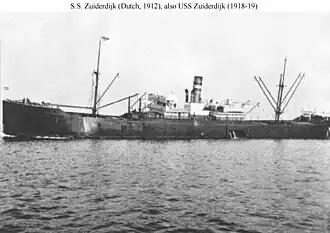 On 21 March 1918 the United States Customs Service seized 89 Dutch ships in US ports under angary. 31 of them were commissioned into the US Navy.[8] Zuiderdijk was commissioned on 23 March as USS Zuiderdijk, with the Naval Registry Identification Number ID-2724.[6]