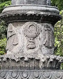 The fountain also features a sculpture of a lady on top of a lotus flower while holding a globe. The lady stands on a cylindrical pedestal adorned by the early disciplines offered in the university, namely the Caduceus for medicine, the Balance Scale for law, the Bowl of Hygieia for pharmacy, the ionic order for architecture, the atom for the sciences, and the total station and tripod for engineering. The lotus flower bowl is carried by four sphinxes. It is surrounded by four owls of Athena and open shells.[8][9]