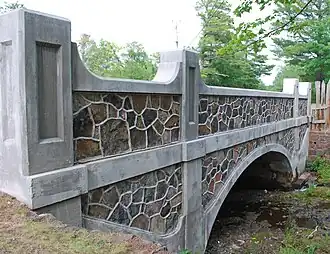 The bridge spanning the Fanny Hooe Creek is a small concrete arch bridge (spanning 25 feet) with an elliptically shaped continuous arch ring and filled spandrels.[2] It sits on a concrete foundation. The endwalls and parapet walls of the bridge have decoratively placed fieldstone work with grapevine mortar joints.[2] Each parapet has four paneled concrete bulkheads which merge into pilasters along the sidewalls below grade level. The bridge is particularly significant because of its decorative stonework (unusual for Michigan bridges) and the degree of craftsmanship in its construction.[2] George Tramp, an engineer with the Michigan State Highway Department in the 1920s, commented that, "after one sees the masonry work on this bridge they will agree that the art work of the stone mason has not been entirely lost."[2]