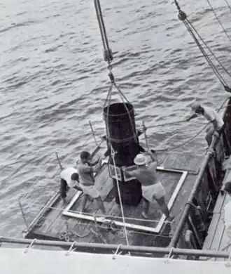 Charles H. Gilbert made her 34th cruise – another skipjack-scouting trip in Hawaiian waters – between 21 June and 21 August 1957[76] and made a major discovery: A “skipjack hole”[77] or “skipjack concourse”[78] – a place where skipjack occur year-round rather than only seasonally[78] – off Cape Kaea, Lanai.[76] Her discovery prompted POFI to begin an intensive study of the "skipjack concourse" in July 1957.[78] She collected physical, chemical, and biological data about the "concourse," finding a temperature discontinuity of 1 to 1.5 degrees Fahrenheit (0.56 to 0.83 °C) over about 0.25 nautical miles (0.46 km; 0.29 mi) in the area and more plankton in the discontinuity than on either side of it.[76] She tagged and released 2,416 skipjack – 1,624 of them between 3 and 13 July alone while fishing in the "skipjack concourse"[77] – in the hope that their movements would shed light on the still-mysterious migration of skipjack into Hawaiian waters each summer,[77] and 212 of the fish she tagged were caught by commercial fishing boats by November 1957.[76] She also experimented with a POFI-designed steel and plastic observation "bucket," a subsurface observation platform which she could suspend about 8 feet (2.4 m) below her hull near her stern, allowing a scuba-equipped scientist to observe directly the underwater behaviors of fish in her vicinity for the first time.[79][80] Reporting visibility as great as 180 feet (55 m), scientists in the "bucket" observed the behaviors of bait fish — nehu (Encrasicholina purpurea), Hawaiian silverside (Atherinomorus insularum), and Mozambique tilapia – around the vessel both when she was fishing and when she was not, and at one point estimated 1,000 skipjack and little tunnies around the vessel.[76] Her experiments determined that a scientist could sit in safety in the "bucket" while the vessel made up to 6 knots (11 km/h; 6.9 mph).[79] POFI hoped that this new technique would allow scientists to use their time more efficiently by directly observing the behavior of tuna with regard to bait and artificial lures rather than inferring their behavior indirectly through the use of statistics.[78] She also operated her Sea Scanar against a school of yellowfin, a number of skipjack schools, and several herds of porpoises, sometimes maintaining contact for several hours, but also learning of the device's operational limitations.[76] She occupied an International Geophysical Year oceanographic station at 21°10′18″N 158°18′48″W / 21.17167°N 158.31333°W on 21 June, 21 July, and 20 August,[76] and carried out a monthly 20-station environmental survey off Oahu in June, July, and August, where she made plankton hauls and bathythermograph casts and collected seawater samples for later analysis of their salinity and inorganic phosphate content.[76] She also made weather reports four times daily, noted sightings of fish, and broadcast information on fish sightings to commercial fishing boats.[76]