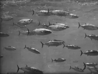 In late June 1959, the USFWS completed the installation of a new observation chamber aboard Charles H. Gilbert, located within her hull in a special blister aft, below the fishing racks and 7 feet (2.1 m) below the waterline[99][100][101] Testing showed that the new chamber was free of the problem of cavitation and the resulting bubbles that had hampered photography from the overside dry chamber she had used earlier, and it had ample room for a photographer to employ still and motion-picture cameras to record fish behaviors.[101][97] The change made Charles H. Gilbert the world's only tuna-fishing vessel at the time with underwater observation windows,[102] a distinction she held until similar windows were installed amidships aboard the California Department of Fish and Game research vessel Alaska in 1961.[103] With her new observation chamber ready, she departed Kewalo Basin in early July 1959 to make use of it in studying skipjack behavior in Hawaiian waters during her 45th FWS cruise.[97] She experimented with the use of various baits and various amounts of bait, with the use of glittering tinsel and water sprays in conjunction with bait, and with the effect of colored dyes and sounds on feeding skipjack.[97] She filmed skipjack from her observation chamber, finding it to be an "outstanding success;" it was comfortable for an operator to use for several hours at a time, and was free of the bubbles that had plagued the earlier overside platform. She also tested the chamber's performance against that of two types of closed-circuit television. Neither television system showed any advantage over the use of the observation chamber;[104] although the television cameras often could see farther underwater than the cameras used in the chamber, the television systems proved too delicate to adjust and operate under tuna-fishing conditions.[97] She placed 73 skipjack in her live wells – 37 of which later were placed in tanks at the USFWS Honolulu laboratory at Kewalo Basin – and conducted a seal and marine turtle census at the French Frigate Shoals in the Northwestern Hawaiian Islands.[97] She completed her cruise on 3 September 1959 after 60 days at sea.[97] The film she brought back made the USFWS Honolulu laboratory the first fisheries research center to record successfully on film the behavior of skipjack underwater, and it allowed scientists to gain a better understanding of tuna behaviors.[105]