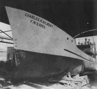 Constructed for use by POFI, Charles H. Gilbert was a 90-or-92-foot (27 or 28 m) (sources give both lengths)[4] steel-hulled research and experimental fishing vessel especially designed for use in investigating tuna fisheries in the mid-Pacific Ocean.[5] She was outfitted for longline fishing, a method Japanese fishermen had used for tuna fishing for centuries and which the FWS hoped to adapt to Western mechanical fishing techniques, in contrast to the Japanese method of longlining by hand.[6] The FWS accepted her at Tacoma, Washington, on 30 April 1952,[7] returning POFI to its authorized strength of three research vessels, and assigned her the hull number FWS 1003.[8]