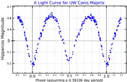- ^ a b c d e f g h i j Antokhina, E. A.; Rao, M. Srinivasa; Parthasarathy, M. (April 2011). "Light curve analysis of Hipparcos data for the massive O-type eclipsing binary UW CMa". New Astronomy. 16 (3): 177–182. arXiv:1011.1739. Bibcode:2011NewA...16..177A. doi:10.1016/j.newast.2010.09.008. S2CID 118460690.