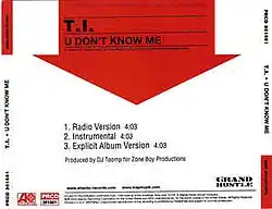 "U Don't Know Me" is a song by American rapper T.I., released on January 11, 2005, as the second single from his third studio album, Urban Legend (2004). The single peaked at number 23 on the US Billboard Hot 100 chart.[1] The song appears in the video game Midnight Club 3: DUB Edition.