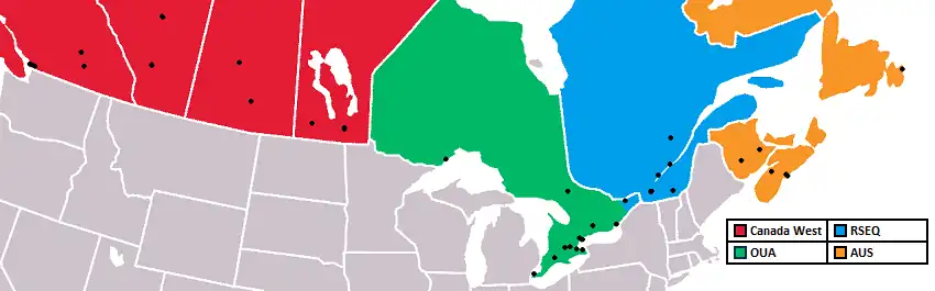As of the 2023-24 season, the RSEQ begin their season first, on the second Friday of October.[17] The Canada West conference begins play one week later and the AUS and OUA schedules begin on the fourth Friday of October.[13][14][18] All regular season games are in-conference and the schedule ends in approximately mid-February.[13]