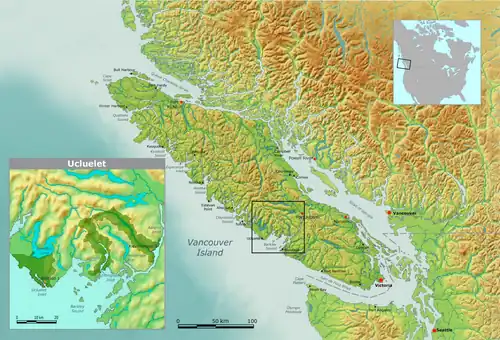 Yuułuʔiłʔatḥ have lived on the west coast of Vancouver Island for thousands of years.[3] Today’s nation comprises the descendants from the families that in the past occupied 9 different villages in the Barkley Sound area: hitaču, ƛakmaqis, ʔuuc, k̓ʷinaqułtḥ, namint, yuułuʔił, w̓aayi, huʔuł, and kʷisitis.[3] Each of the villages historically had one longhouse for summer and winter usage.