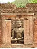 Numerous excavations by the Archaeological Survey of India (ASI) have been conducted at Udayagiri since 1958.[4] The Udayagiri Site 1, the first site to be excavated, is in a depression between two valleys.[2] In the excavations done between 1985–86 and 1989–90 at the Udayagiri Site 2, the antiquities exposed consisted of a Buddhist Monastic complex enclosed within a compound wall, including a stupa of 7 metres (23 ft) height with four images of dhyani Buddhas fixed at its four cardinal points. On the basis of the epigraphical evidence, archaeologist have inferred that this site is "Madhavapura Mahavihara". During the large excavation from 1997 to 2000, a second part of Udayagiri-2 was discovered with additional stupas and monasteries. These antiquities consist of two eighth century monastic complexes, statues of Buddha, Tara, Manjusri, Avalokiteśvara, Jatamukuta Lokesvara and many terracotta (earthenware) seals.[4] A stepped stone well with epigraphic inscriptions has also been discovered.[1] Also seen near one of the entry gates at the site is a human figure swinging on a rope, with eyes closed, in a state of perfect happiness.[2]