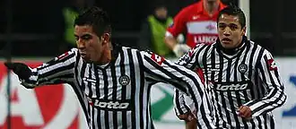 The only significant innovations came in the 1980s when the Friulian team's clothing diverged from tradition, presenting more imaginative solutions: notably, the white shirts with a black central bar used in the first part of the decade, followed by black shirts with a massive white stripe across them.[6][2] From the 1990s onwards, there was a gradual return to simplicity, although experiments like "curved" stripes along the upper edge were made in the mid-2000s.[7]