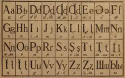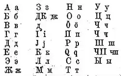 The question of translating the Udmurt alphabet into the Latin alphabet was first raised in 1927 by the academic center of the Votyak regional department of public education. In 1928, the first draft of the Latinized alphabet was drawn up. In May 1930, at a regional party conference, a discussion took place about the possible romanization and the appearance of the new alphabet. At the same time it was decided to develop a unified Latinized alphabet for closely related Udmurt and Komi languages, which was done in 1931.[23] In the summer of 1931, the unified Komi-Udmurt Latinized alphabet was approved, after which its introduction into life was to begin. However, if the Komi alphabet was introduced a year later, then in Udmurtia no real steps were taken to implement this project. B. Grande wrote that by December 1932 no steps had been taken towards a real transition to the Latin script, the reason for which was the negative attitude of the regional authorities towards the reform in general and the lack of funding.[24]