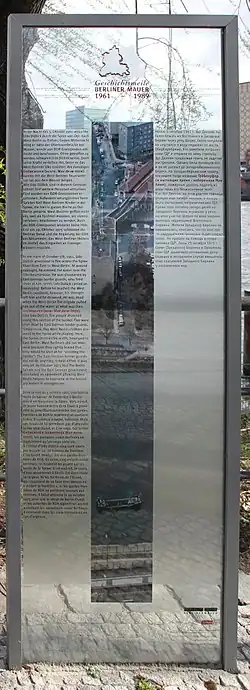 During the escape, people from West-Berlin watched the action. However, they had to stay on the wharf because the Spree fully belonged to the territory of East Berlin. The day after his death, 2.500 people from West Berlin gathered at Gröbenufer, for a funeral. The brother of Udo Düllick, who was living in the West, identified the corpse. The funeral service was on 18 October 1961 at the Jerusalem cemetery in Berlin-Kreuzberg.[2] Gröbenufer today has a memorial stone, which was erected the same year. A cross of the memorial White Crosses on Reichstagufer commemorates Udo Düllick.