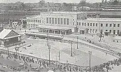 After the destruction of the first building in the fires caused by the 1923 Great Kantō earthquake, Japanese Government Railways constructed the current station building. While digging the foundations of the new building, bones, swords, and lances dating from the Battle of Ueno where excavated.[3]