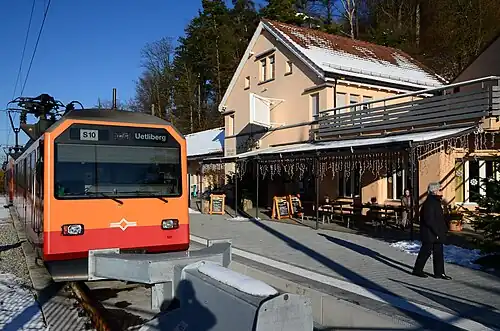 Uetliberg railway station, situated near the summit of Uetliberg mountain, the Hausberg of the city of Zurich in Switzerland, is the upper terminus of the Uetliberg line of the Sihltal Zürich Uetliberg Bahn (SZU), within fare zone 155 of the Zürcher Verkehrsverbund (ZVV).[2] The railway station is located within the municipality of Stallikon, although the adjacent mountain-top is divided between Stallikon and the city of Zurich.[3][4][5]