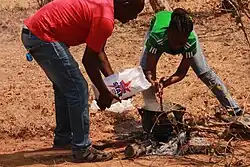 The maize flour is first boiled with water into a porridge,[26] and, in Zambia, left to simmer for a few minutes before it is 'paddled', to create a thick paste with the addition of more flour. This process requires the maker to pull the thick paste against the side of a pot with a flat wooden spoon (nthiko in Malawi, m'tiko/umwiko in Zambia) quickly whilst it continues to sit over the heat. Once cooked the resulting nshima/nsima is portioned using a wooden/plastic spoon dipped in water or coated in oil called a chipande (Malawi), and chipampa (Zambia). In Malawi each of these portions is called a ntanda.[26]