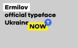 The main typeface of the brand is the Yermylov Bold typeface, which was created specifically for the Ukraine NOW brand. Its author was inspired by the works of Ukrainian constructivist artist Vasyl Yermylov.[1]