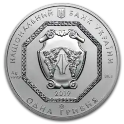 Obverse: The coat of arms of Ukraine and the inscription "НАЦІОНАЛЬНИЙ БАНК УКРАЇНИ" (National Bank of Ukraine) are at the top of the coin. Inside an octagonal cartouche at the centre is a shield with the emblem of the National Bank of Ukraine. At the bottom of the coin, it is inscribed in Ukrainian the value of the coin. On the one-ounce silver coin, it is inscribed with "ОДНА ГРИВНЯ" (one hryvnia).[1]
