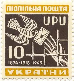 The Ukrainian Underground Post (Ukrainian: Підпільна пошта України, converted in Ukrainian Latin alphabet to Pidpilna Poshta Ukrainy (abbeviation: PPU)),[9][8] also known as the Underground Post of Ukraine, was founded by Ukrainian exiles from West Germany in 1949 under a branch of the Organisation of Ukrainian Nationalists.[10] According to PPU stamp cataloguer and philatelist Stefan Golash, Regensburg resident and former 14th Waffen Grenadier Division of the SS (1st Galician) volunteer Stepan Liubomyr Rychtyckyj (writing under the pseudonym Stefan Liubomyrsky) first took interest in writing and philately while he and his former division were interred in a prisoner of war camp in the Italian city of Rimini until his release in 1946. In 1949, he met Ukrainian philatelist and fellow Regensburg resident Julian Maksymchuk, who with the latter's influence and guidance established the postal agency, which released its first set of stamps the same year.[10][8] As an internationally unrecognized postal agency, the Underground Post of Ukraine issued non-state postage stamps that were primarily used for propaganda purposes.[7]