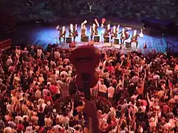 Several sources have mentioned that the orchestra is "often blamed for the current ukulele revival which is sweeping the globe", with other ukulele orchestras and groups, following UOGB's lead, have "spawned" over the years in most major cities around the world.[10][18][70] The UOGB began the approach of orchestrating songs so that each ukulele played a separate part ~ “since then we’ve seen the concept of ensemble ukulele playing flourish right across the world.”[71][12][72][73] Asked by the Sydney Morning Herald to explain the success of his orchestra, Hinchliffe replied "the world has gone ukulele mad".[11] The question Why is everyone suddenly playing the ukulele? is asked by a Daily Telegraph article, research by ABRSM (Associated Board of the Royal Schools of Music), the exam board of the Royal Schools of Music, has found that the ukulele is replacing the recorder as the instrument of choice for school ensemble music lessons.[71] There are a multiple reasons for this, the ukulele has become a popular instrument to take up, with the Classical Music website of the BBC Music Magazine stating thas the UOGB "has played a major part in popularising the ukulele, with sales at music stores booming and the instrument becoming a mainstay of schools’ music curriculum".[64] The UOGB itself has donated large batches of ukuleles to schools over the years. The orchestra also often run Ukulele workshops for fellow ukulele players and school children in the afternoons before gigs, including with thousands of young players in a stadium in New Zealand.[71][74] Prior to gigs the orchestra also gives out advance notice of an audience participation tune so that those that wish to participate can bring along their own ukulele and play along with the orchestra.[35][14][75]