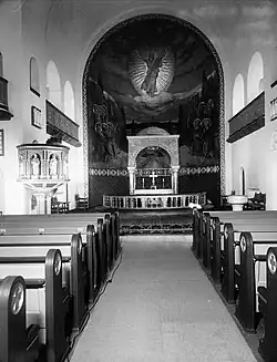 The church is dominated by its choir apse with the fresco The Ascension, painted by Eilif Peterssen in 1908–1909. It was created in close collaboration with Domenico Erdmann. Over the altar, in front of the fresco, is a marble baldachin designed by Bødtker. The pulpit was also designed by Bødtker, and the baptismal font is from the company Johs Grønseth & Co. The stained glass dates from 1915 to 1915; it was designed and created by various artists, including Gabriel Kielland and Karl Kristiansen (1886–1971).[5]