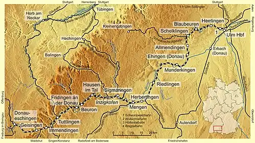 The Ulm–Sigmaringen railway runs alongside the Danube river and crosses it several times. At Ehingen (Donau), the line leaves what is known as the Danube valley today, and follows the valley formed by the Danube in times past, along the rivers Schmiech, Ach, and Blau. The railway touches the border of the Swabian Jura (Schwäbische Alb) between Allmendingen and Blaustein, and meets its eponymous river again at the line's terminus in Ulm.