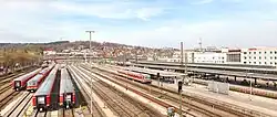 Shorter trip times, as well as the move of the single-track train crossing points between Tuttlingen and Sigmaringen, would also be the pre-requisites for the development of a Stadtbahn Tuttlingen, which has been under discussion since 2006. This model would use the Donautalbahn, which runs through the city center, as well as residential and industrial areas in the Tuttlingen area, as a city rail line (Stadtbahn), and would connect the communities east of Tuttlingen, which are poorly served by the Ringzug, to this network.[7] Probably the most ambitious plans are the ones for a S-Bahn network Ulm/Neu-Ulm. These plans, extant since the 1990s, envision the construction of a new rail line, which would branch off the existing Donautalbahn in Ehingen (Donau) and go to Erbach (Donau) on the Südbahn. This new railway would see only the RegionalExpress trains going from Ulm via Sigmaringen to Neustadt (Schwarzwald), which would significantly cut the trip times. The old section between Ehingen via Blaubeuren, which is densely populated, would be served by a new S-Bahn in the Ulm area. The new section has been tagged with a cost of 75 million Euros. The regional association Donau-Iller supports these plans, which are opposed by the government of the state of Baden-Württemberg.[8][9]