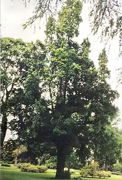 No surviving specimens are known, but a non-grafted field elm cultivar would be expected to regenerate through root-suckers. Three specimens were supplied by Späth to the Royal Botanic Garden Edinburgh in 1902 as U. campestris monumentalis, Späth's name for Rinz's tree. One was planted in the garden proper on the azalea lawn as tree C2713, a suckering, narrow-pyramidal or columnar elm resembling a wild cypress (about 11 m tall by the late 1990s), with twisted, dense upright branching and small dark-green leaves.[25][26] By 1958, when Melville examined it, its cultivar name had been dropped because 'Monumentalis' was by then assumed to be a synonym of 'Sarniensis'. Melville determined it U. carpinifolia × U. plotii × U. glabra.[27][25] The leaves were pilose above and rather distorted, the lower surface with a zone of dense hair towards the base of the midrib.[28] The tree was one of the first RBGE elms into leaf. The other two from Späth, or regrowth from them, may survive in Edinburgh, as it was the practice of the Garden to distribute trees about the city (viz. the Wentworth Elm);[29] the current list of Living Accessions held in the Garden per se does not list the plant.[30] Elsewhere, U. campestris monumentalis appeared separately from U. campestris sarniensis in the early 20th-century catalogue of the Ryston Hall arboretum, Norfolk, whose elms were supplied by Späth.[31] One tree from Späth was planted in 1893 as U. campestris monumentalis at the Dominion Arboretum, Ottawa, Canada.[32]