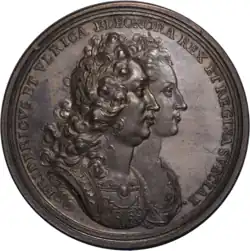 In 1702, a marriage to the future King George II of Great Britain was suggested, but was postponed, and in the end nothing came of it.[1] Duke John William of Saxe-Gotha was given permission by her brother to court her, but the marriage plans were interrupted after he engaged in a duel with Anders Lagercrona in the presence of the monarch.[1] In 1710, she received a proposal from Prince Frederick of Hesse. The negotiations were handled by her favorite and confidante Emerentia von Düben. The marriage was supported by her grandmother Hedwig Eleonora, as the Queen Dowager thought this would force Ulrika Eleonora to leave Sweden for Hesse, increasing the chances for the son of Ulrika Eleonora's elder sister, Hedvig Sophia of Holstein-Gottorp, to become heir to the throne. The engagement was announced on 23 January 1714, and the wedding took place 24 March 1715. During the wedding, her brother Charles XII remarked: "Tonight my sister is dancing away the crown".[3]