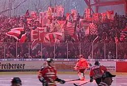 Ultras are a type of ice hockey fans mainly in European ice hockey culture who are known for their fanatical support of a club. The term originated in Italy and comes from the Latin word ultra, meaning "beyond" or "farther", but is used worldwide to describe predominantly organised fans of sports clubs. Ultras fans in ice hockey are known for organised chants, tifo choreographies, flags and sometimes flares.[1][2][3]