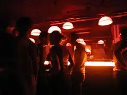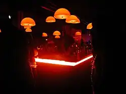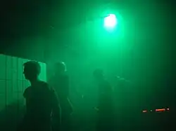 The complete party area of the Riem airport now moved to the Kunstpark Ost, a former factory site of 90.000 m2 close to the Ostbahnhof train station in Munich's Berg am Laim district. Ultraschall was re-opened there by Michi Kern and colleagues in the former potato drying facility of the Pfanni factory on 13 September 1996.[12] The new premises were much larger than the first Ultraschall and allowed to establish two dance floors. The main floor was located in the factory's former swimming pool for washing potatoes and, as with the first Ultraschall club, was completely lined with white ceramic tiles and divided by columns. The floor tiles were later covered by a wooden floor.[13] The space, characterized by simple geometric shapes, had the ambience of an industrial production site, but due to its strong angularity it did not have the atmosphere of a warehouse club.[14] The main floor was known for the cold clanking sound,[15] as well as for the wooden floor which was vibrating strongly due to the basses.[4] Due to its decoration with green flokati, the second floor became known as the Green Room. Since 1998 this room served as a home base for the popular Flokati House Club, which was initiated by Tobi Neumann and in the 2000s moved on to the Harry Klein Club when Ultraschall closed. On Saturdays, the green room served as the chill out for the Main Floor, which provided space for 1,500 people and where international acts such as Jeff Mills, Carl Craig, Jay Denham or Green Velvet played. Just as the Ultraschall I, its successor put a lot emphasis on decoration, light installations and video art by the Highflyer crew,[5][16] and both incarnations of the club are considered as being some of the best decorated venues of all time.[10] When the Kunstpark Ost party areal had to close on 31 January 2003, Ultraschall had to close as well.[4]