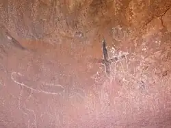 One of the major stories associated with Uluru is the Mala story. In this, the Mala (rufous hare-wallaby) people came from the north, and decided to stay at Uluru for a while, and perform the ceremony known as inma. The men decorated and raised the ceremonial pole (Ngaltawata) and began inma, while the women gathered and prepared bush food, storing seed cakes (nyuma) in their caves. The men hunted, made fires, and fixed their tools and weapons. Two Wintalka men approached from the west, and invited the Mala people to attend their inma, but the Mala people declined the invitation, as their inma had begun and could not be stopped. The Wintalka men went back and told their people, who got angry and created an evil spirit, in the form of an enormous devil-dog called Kurpany, in order to wreck the Mala inma. Kurpany approached the Mala people, changing form as he did so, including taking the form of a ghost (mamu). Luunpa (the kingfisher woman) spied him first, and warned the Mala people; however, they did not listen to her. Kurpany attacked and killed some of the men, and the remaining Mala people fled southwards, into what is now the state of South Australia, with Kurpany in pursuit. This story continues among the Indigenous peoples of South Australia.[56]