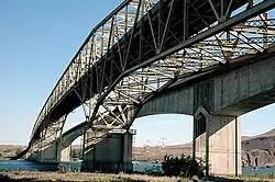 The Umatilla Bridge is the collective name for a pair of bridges in the northwest United States, carrying Interstate 82/U.S. Route 395 (I-82/US 395) across the Columbia River at the Washington–Oregon border. The older bridge opened in July 1955 and is a steel through truss cantilever bridge and carries southbound (east on I-82) traffic. Northbound traffic (west on I-82) and pedestrians travel on the newer concrete arch bridge, opened in 1988.