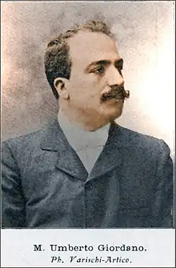 He was born in Foggia in Apulia, southern Italy, and studied under Paolo Serrao at the Conservatoire of Naples.[1] His first opera, Marina, was written for a competition promoted by the music publishers Casa Sonzogno for the best one-act opera, remembered today because it marked the beginning of Italian verismo. The winner was Mascagni's Cavalleria rusticana. Giordano, the youngest contestant, was placed sixth among seventy-three entries with his Marina, a work which generated enough interest for Sonzogno to commission the staging of an opera based on it in the 1891–92 season.[2]