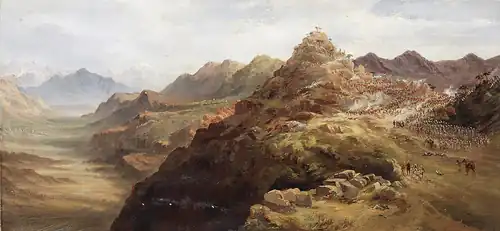 Oil canvas depiction of war between the Yusufzai Afghans and British Empire