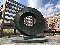 Helaman Ferguson has created a 27-inch (69 centimeters) bronze sculpture, Umbilic Torus, and it is his most widely known piece of art. In 2010, it was announced that Jim Simons had commissioned an Umbilic Torus sculpture to be constructed outside the Math and Physics buildings at Stony Brook University, in proximity to the Simons Center for Geometry and Physics. The torus is made out of cast bronze, and is mounted on a stainless steel column. The total weight of the sculpture is 65 tonnes, and has a height of 28 feet (8.5 m). The torus has a diameter of 24 feet (7.3 m), the same diameter as the granite base. Various mathematical formulas defining the torus are inscribed on the base. Installation was completed in September, 2012.[3]