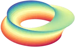 The umbilic torus occurs in the mathematical subject of singularity theory, in particular in the classification of umbilical points which are determined by real cubic forms . The equivalence classes of such cubics form a three-dimensional real projective space and the subset of parabolic forms define a surface – the umbilic torus. Christopher Zeeman named this set the umbilic bracelet in 1976.[1]