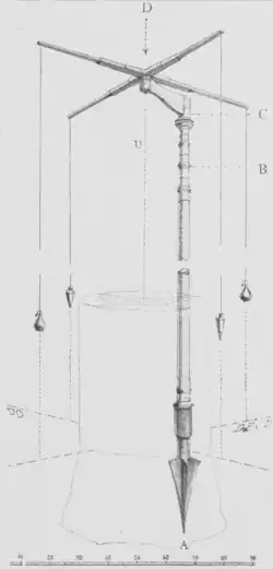 Umbilicus soli (the "ground navel") was the name for the reference point of the Roman surveying tool, the groma, located at the moving end of a swinging arm, with a plumb bob suspended underneath.[5][6][7][8] The purpose of offsetting the reference point from the Jacob's staff (vertical pole) was twofold: it enabled sighting of lines on the ground through a pair of strings (used to suspend an opposite pair of plumbs from the cross) and allowed placing the reference point over a sturdy object (like a boundary stone), where the staff cannot be inserted.[6]