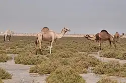 The eastern section is situated over a low, rocky promontory which is enclosed by sabkhas on the coast. The sabkha region is 40 kilometres (25 mi) long and between 7 kilometres (4.3 mi) and 10 kilometres (6.2 mi) wide. The southern portion of Mesaieed is characterized by sand dunes.[12] These dunes are in a state of constant migration, propelled by the dominant north-northwestern wind known locally as shamal.[23] To the northeast of the coast, where the residential section is located, there are sandy hillocks which lie 9 m above sea level.[24] Roughly 262 hectares of mangroves are found around Mesaieed's coastline.[25]