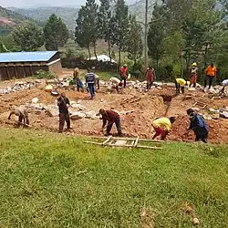 In the late 1800s, Belgian elites in Rwanda wanted to limit the King's monetary flow and bring about the end of the patronage system.[1] Belgian elites used the idea of umuganda to enforce a new communal work system of uburetwa. Uburetwa was a communal work system that forced every adult male to participate in 60 days of community labor per year. This system was initiated in the 1940s and was implemented by local leaders.[1] It left people with little time to provide for themselves, and often they were unable to sustain their families. In the 20th century, Rwandans were recorded as being required to work for their community leader twice a week, while the Belgians encouraged "umuganda" as a way of life.[6]