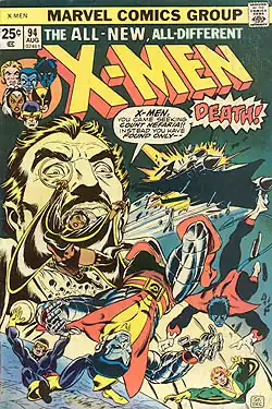 Uncanny X-Men #94 (originally published simply as The X-Men) is a comic book starring the X-Men that was published by Marvel Comics in August 1975. From issues #67–93, cover dated December 1970 to April 1975, the X-Men series consisted of reprints due to lack of sales. In May 1975, Giant-Size X-Men #1 was published, and Professor X recruited a new team consisting of several foreign nationals to save the X-Men. With issue #94, the magazine was revived,[1] and all of the original X-Men quit, save team leader Cyclops, and are replaced by such "All-New, All-Different" X-Men as Storm, Wolverine, Nightcrawler, and Colossus. A former X-Men adversary, Banshee, also joins the team at this point. Sunfire returns to Japan in this issue, and Thunderbird dies in issue #95.[2]