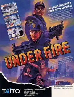 Under Fire[a] is a light gun shooter released as an arcade game in 1994 by Taito. The game uses graphics created using digitized photographs and two player gameplay using gun controllers, similar to Konami's Lethal Enforcers. Unlike Lethal Enforcers, the controllers are not traditional light guns but rather operate using infrared technology. They also provide force feedback when the player pulls the trigger. The game was never released for home consoles.