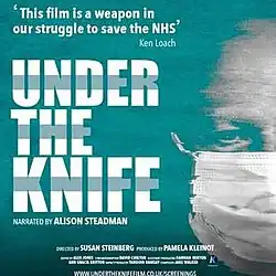 Under the Knife is a 2019 feature-length documentary film directed by Susan Steinberg, produced by Pamela Kleinot and narrated by actor Alison Steadman. Supported by Britain's Labour Party, health trade unions, and the campaign group Keep Our NHS Public, it argues that England's state-run National Health Service (NHS) is being intentionally privatised and underfunded. Though its premise and conclusions have been disputed, Secretary of State for Health and Social Care, Matt Hancock has stated in Parliament that he considers to be outdated arguments about a split between public and private in healthcare.[1] NHS funding going to private firms escalated during the 2020-21 COVID-19 pandemic.[1]