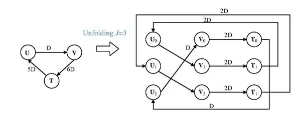 - For each edge U arrow → V with w delays in the original DFG, we create the edges on transformed graph by Ui arrow → V(i+w)%J with for i = 0, 1, ... J − 1.