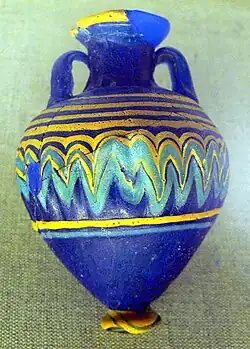 Glass unguentaria vary widely in quality and show a range of colors. The Judean desert caves, for instance, yielded unguentaria of aquamarine glass with large bubbles.[59] A striking example of a glass fusiform unguentarium from 1st-century Syria, a little over six inches tall, has a white spiral curling around the cerulean body. The base comes to an elongated, rounded point, and the lip is well-formed and prominent.[60] Techniques of "marbling," intended to emulate fashionably extravagant vessels made of sardonyx during the reigns of Augustus and Tiberius, were used for unguentaria as well as bowls.[61]