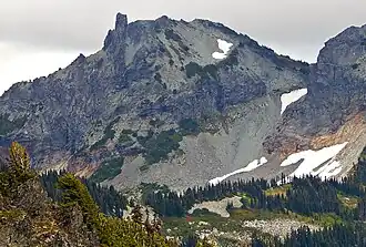 Unicorn Peak is a 6,971-foot (2,125-metre) mountain summit in Lewis County of Washington state, United States. It is the highest point in the Tatoosh Range which is a sub-range of the Cascade Range.[1] It is located in Mount Rainier National Park, south of Mount Rainier. Precipitation runoff from the mountain's small glaciers, such as Unicorn Glacier, drains into tributaries of the Cowlitz River. The descriptive name is for the mountain's resemblance to the head and horn of a unicorn. The toponym was officially adopted in 1913 by the U.S. Board on Geographic Names.[3]