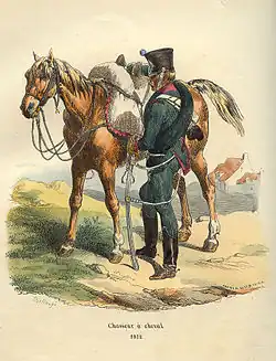 The uniform of the light cavalry (or Chevaux-légers) of the line consisted of a green coat with turnbacks and lapels of the regimental facing color, which could be crimson, red, blue, pink or yellow. The collar and cuffs were of the facings color, the green shoulder straps and the breeches were piped with the facing color. The uniform comprised pewter buttons, black boots, a brass helmet with a brass crest supporting a woolen crest named chenille (caterpillar, in French), a sealskin turban, black leather visor, brass chin scales and red epaulettes for elite companies.