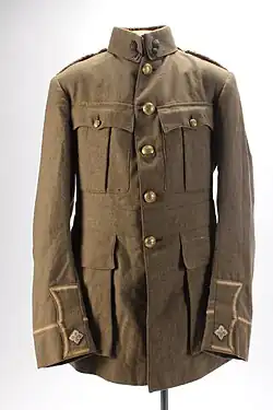 The uniforms worn on the Western Front included a mounted service pattern greatcoat, the Brodie helmet when in combat, and the universal combat boots and puttees wrapped around the legs.[11] The conspicuous coloured branch facings were phased out after 1916, although surviving on the campaign hats.